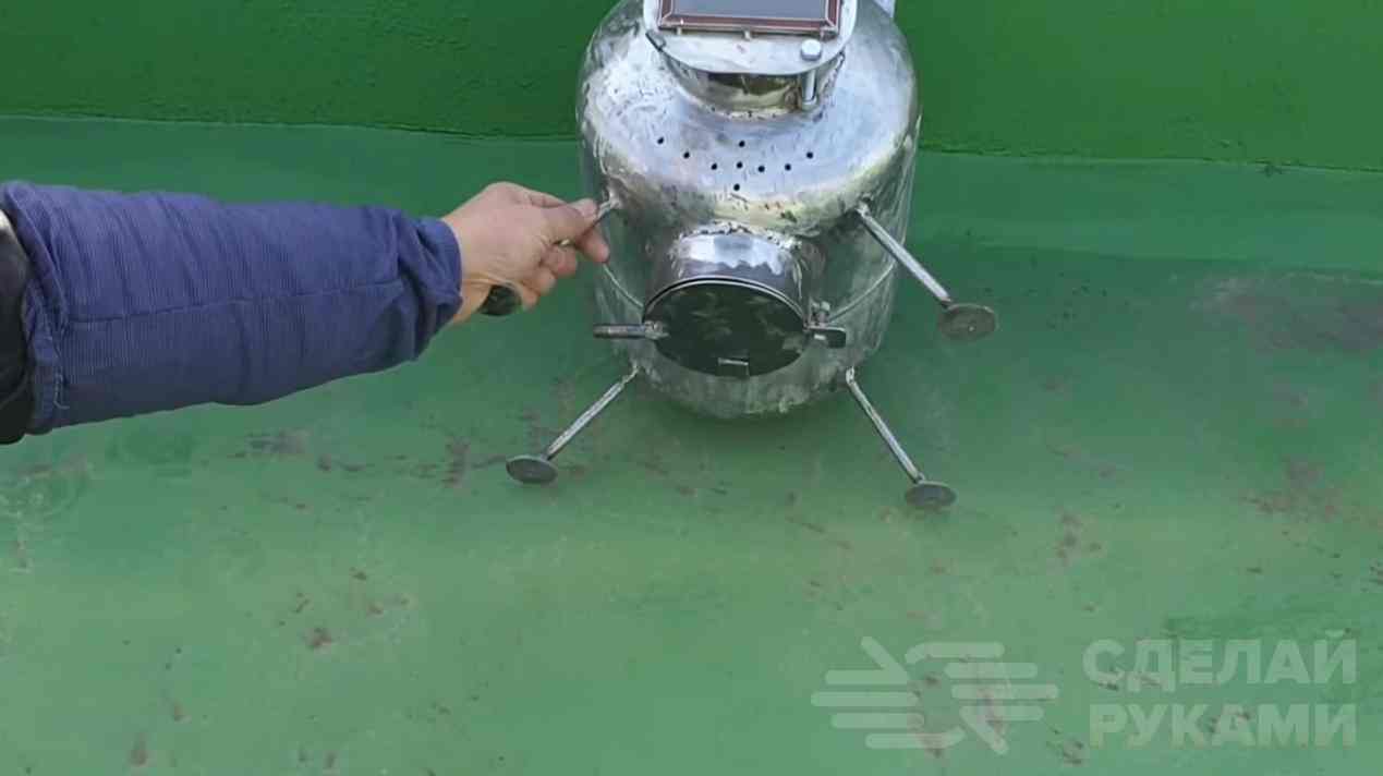 - Первый баллон для пропана аналогичен предыдущему варианту. Единственное отличие, что вместо колосников, прорезаны щели сверху самого баллона.