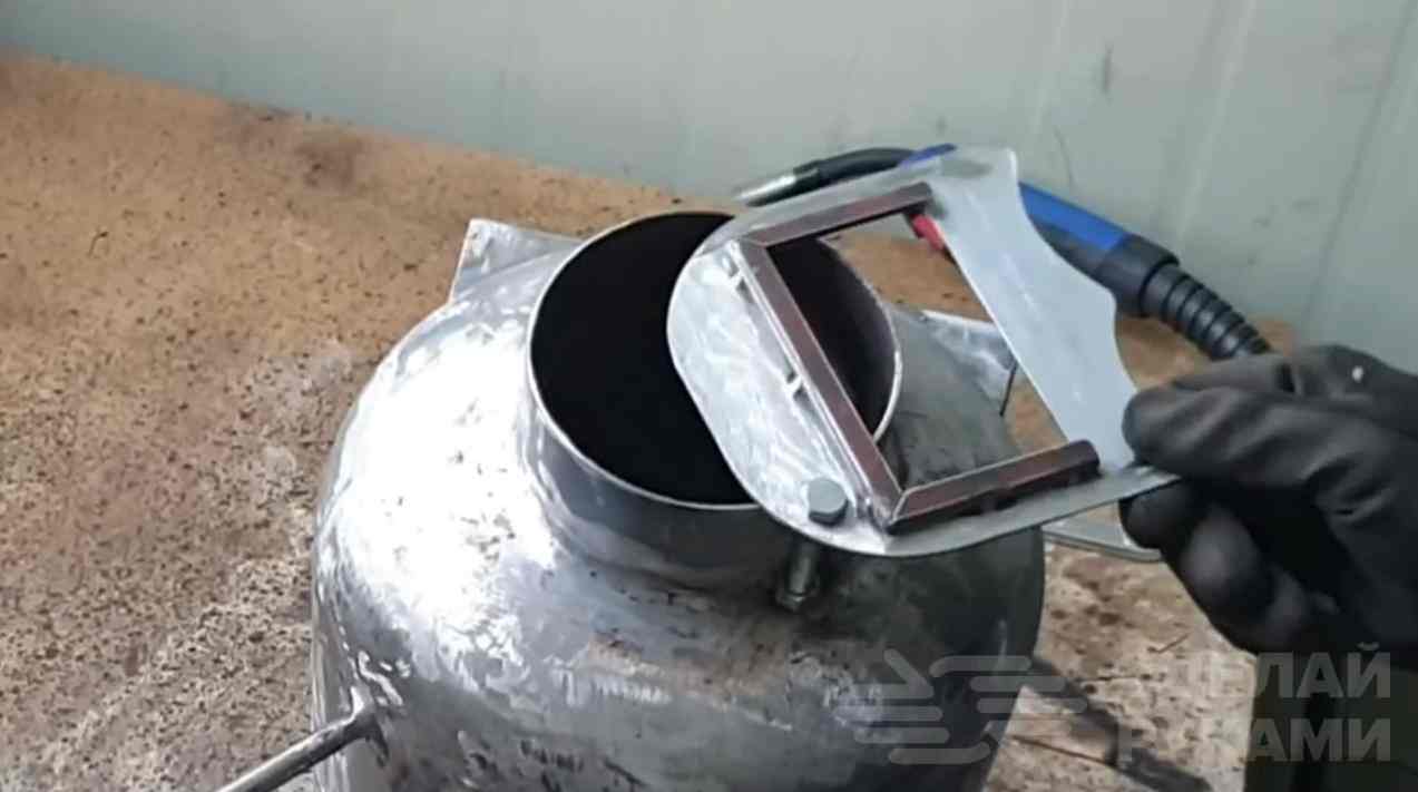 Вырезанную из баллона заготовку используем в качестве крышки для дымохода. Она нужна для более долгого горения.