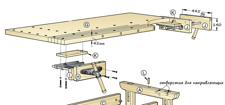 Губки тисков – детали H, I и J (2 шт.) – выпиливают из древесины твердых пород. После этого просверливают отверстия для направляющих штанг, ходового винта, гнезда для верстачных упоров и отверстия для крепежных винтов.