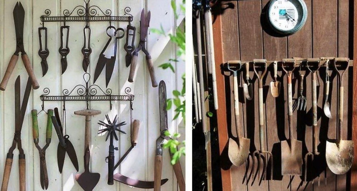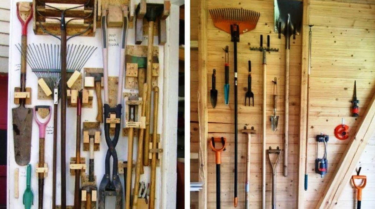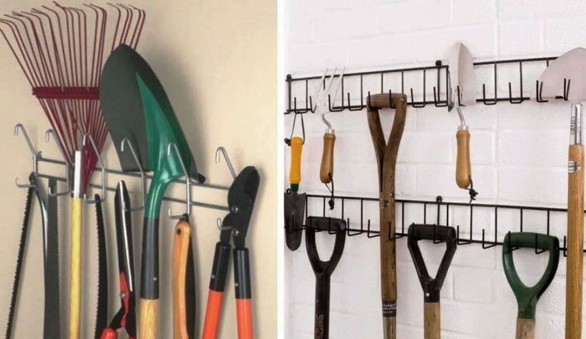 Опытные садоводы пользуются данным вариантом для размещения ножовок и секаторов. Но можно повесить и другие предметы, главное – выбрать крепкие крючки, подходящие по форме и размеру.