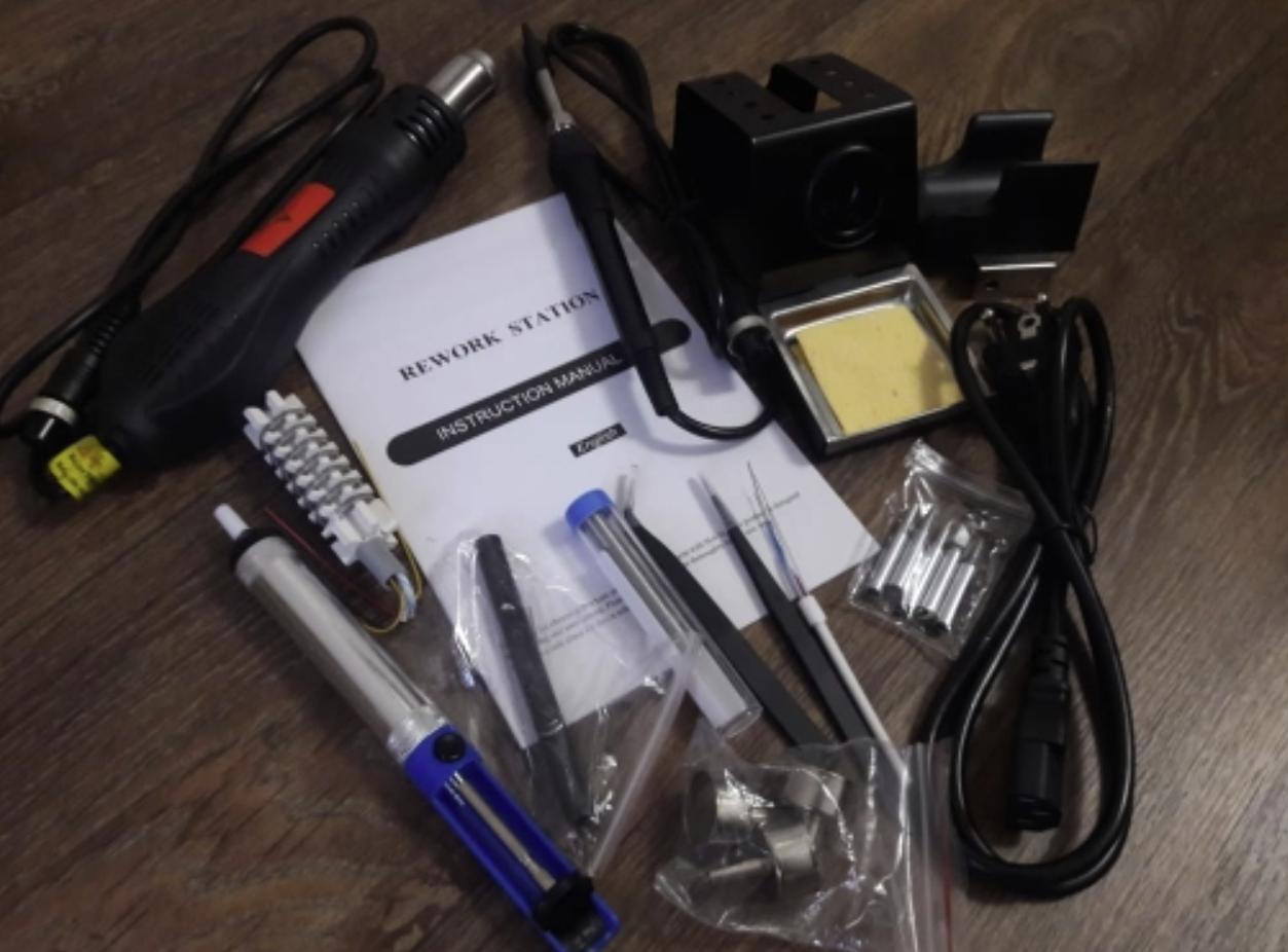 В комплект входят вакуумный отсос, припой, два пинцета и что особенно важно — запасные нагревательные элементы для паяльника и термофена