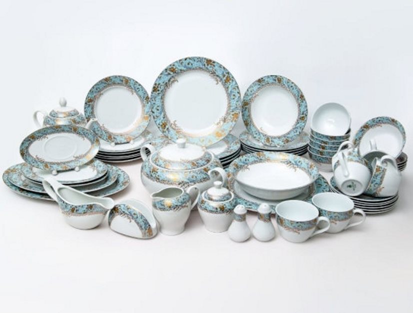 Сервиз рассчитан на 6 персон. Состоит из 60 предметов, куда входят салатники, суповые тарелки и десертные изделия. Всех по 6 штук. Помимо перечисленного, в наборе имеются селедочницы, перечницы, солонки, молочник, сахарница, чашки, блюдца, чайник и супница с крышкой, соусник, подставки, овальные и круглые блюда. Вся посуда украшена цветами. Выполнена из костяного фарфора высокого качества. Материал экологически чистый и безопасный для здоровья людей. Прозрачность, прочность и белизна впечатляют. Желательно мыть руками такой дорогой комплект. Использование СВЧ-печи для разогревания продуктов не предусмотрено. На полки магазинов поставляется в подарочной упаковке. Несмотря на китайское происхождение, претензии к товару отсутствуют. Общий вес – 21 кг.