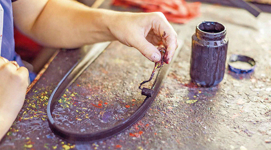 - К примеру, можно применить технику плетения с четырьмя шнурками, закрепив к двум концам кольца, чтобы их потом соединить в браслет. Таким же образом можно делать и ремни для сумок.