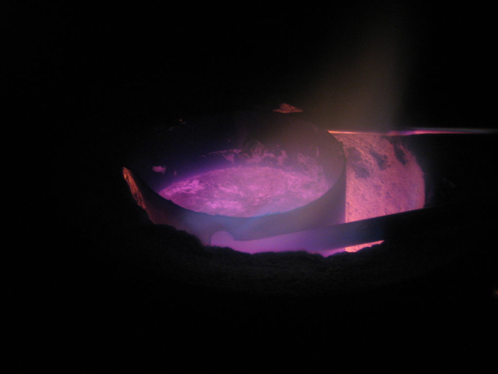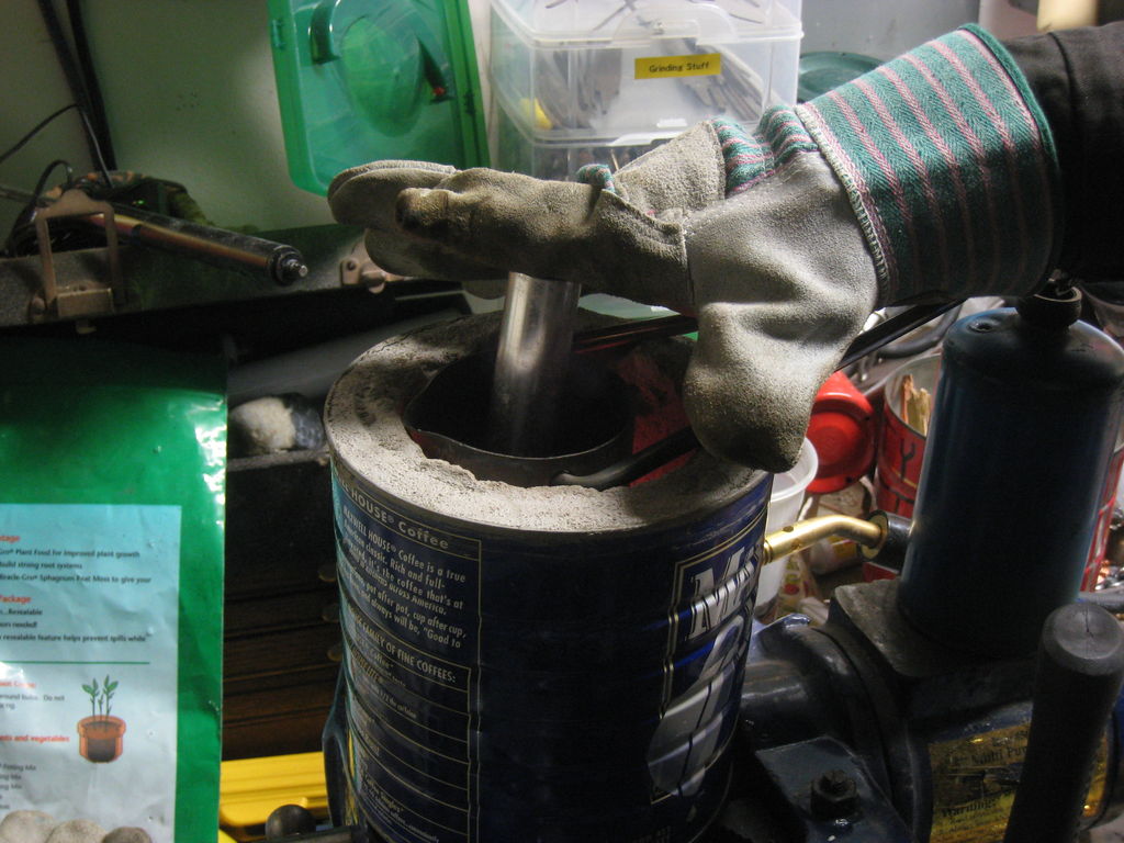 Запускаем печь, ждем ее разогрева, на необходимую температуру печь выходит уже через час, корпус печи при этом нагревается, но не сильно. Теперь снимаем пробку и через горловину загружаем алюминий для расплавки. Это могут быть банки из под напитков, стружка и другой источник алюминия. В процессе желательно помешивать алюминий.
