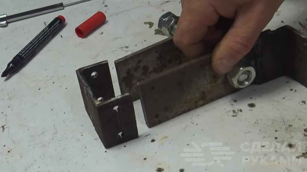 В верхней части конструкции и в самой подвижной площадке сверлим отверстие и устанавливаем кусок шпильки. При помощи шпильки можно будет опускать и поднимать площадку.