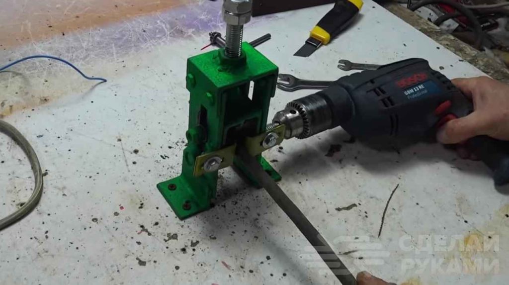 Вал, на котором находятся конусные ролики, может приводиться в движение вручную с помощью рукоятки. Либо же можно вставить конец вала в патрон дрели — для автоматической работы.