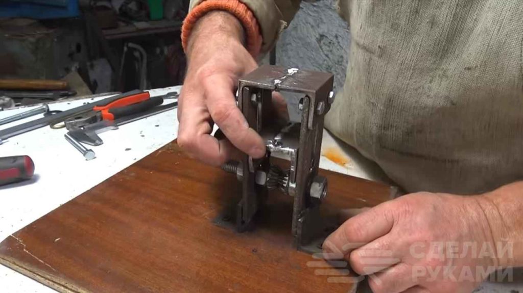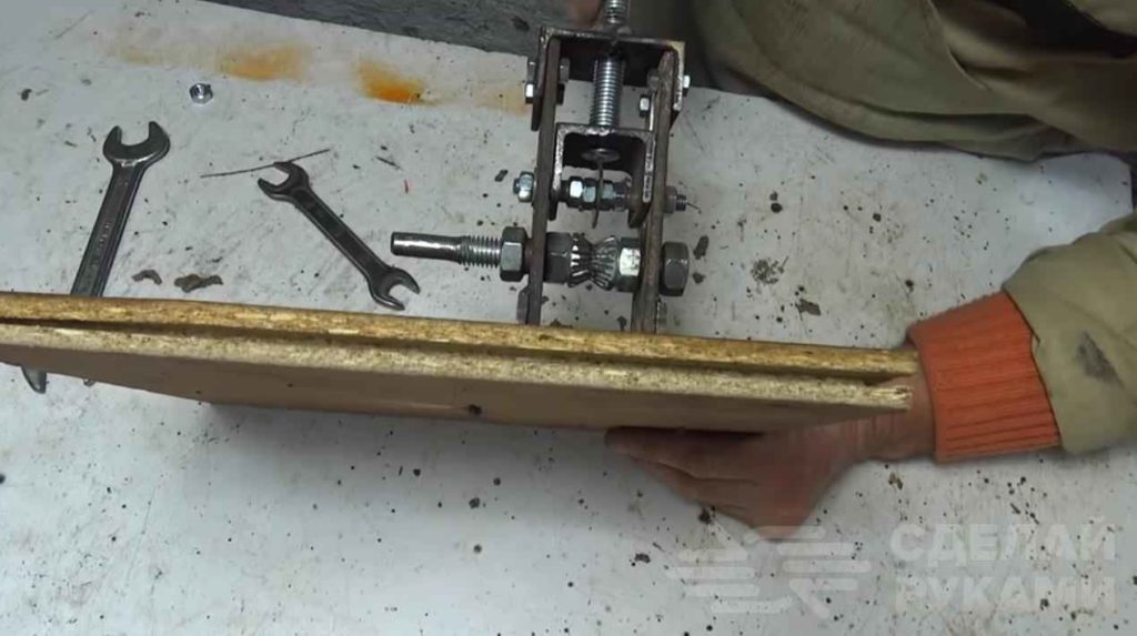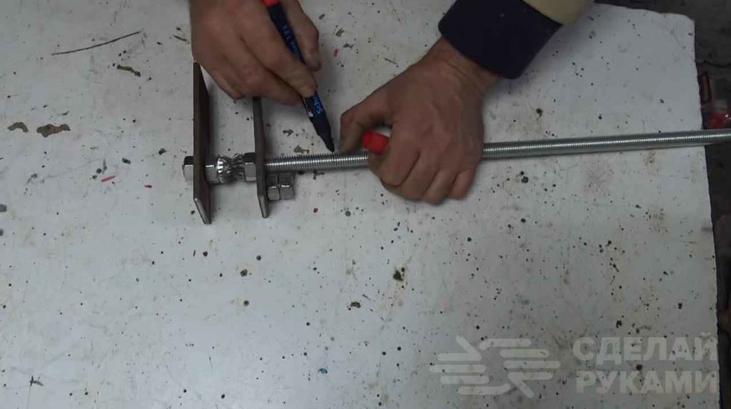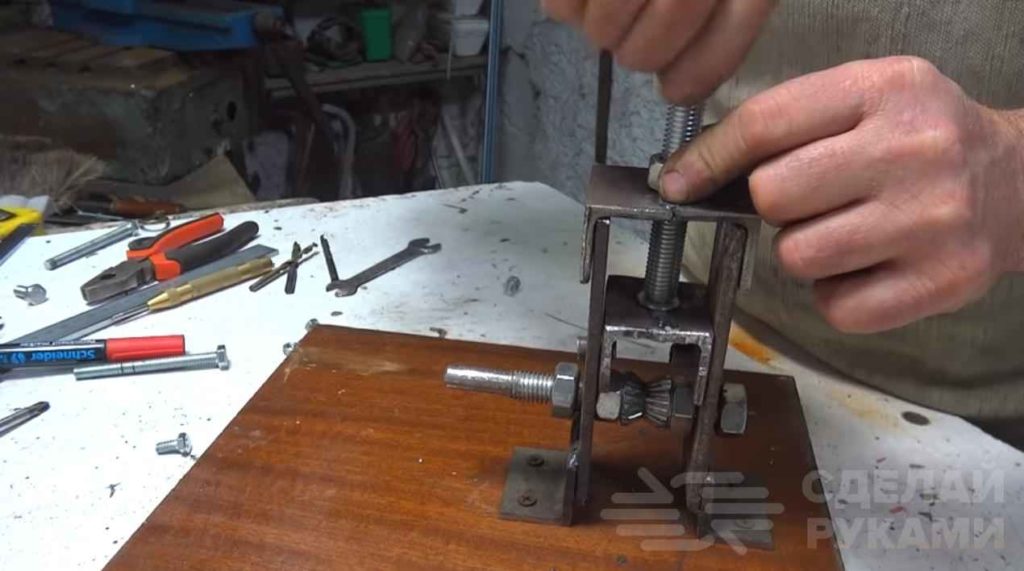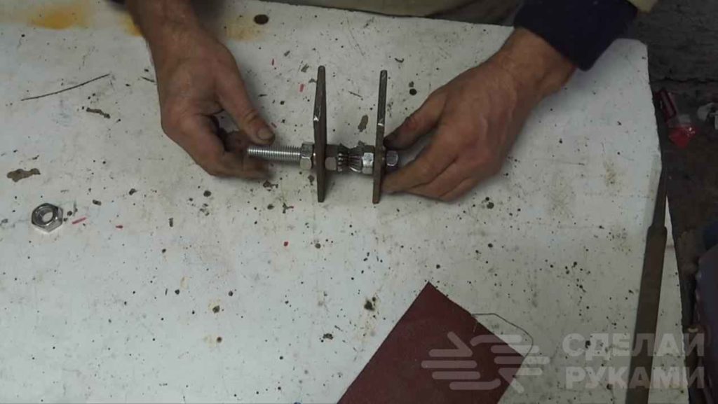 Конусные ролики надеваем на вал (в данном случае — это резьбовая шпилька) и фиксируем гайками. Две металлических пластины выступают в качестве боковых стенок. Сверлим в них отверстия под вал.