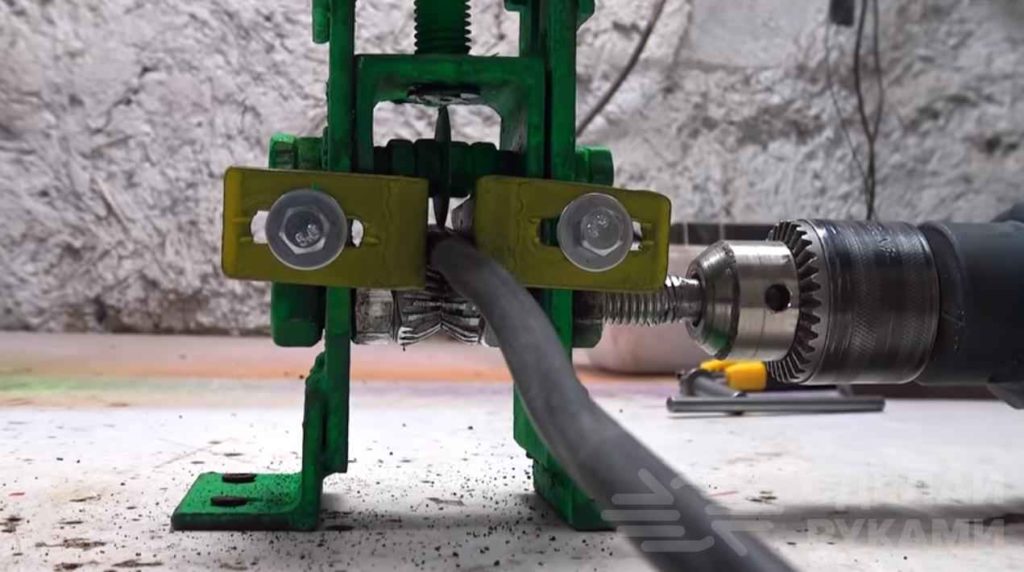 После установки кабеля приводят в движение конусные шестерни. Нож разрезает изоляцию вдоль провода. Остаётся смотать оголённые провода в компактную катушку или скрутить в удобный пучок.