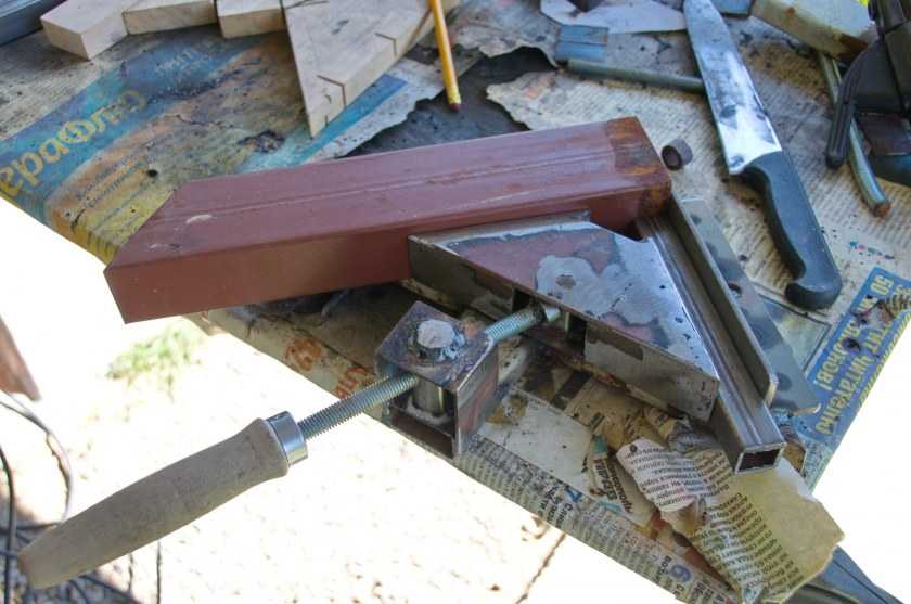 Приварить неподвижную часть губок на предварительно приготовленную планку длиной 50 см и шириной 3 см. На сами губки необходимо изготовить деревянные наконечники, для того чтобы во время зажима не царапать изделие.