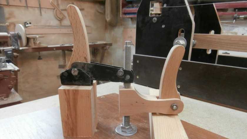 Шаг 5 — Упорные шайбы можно применять традиционные. Из бруса выпиливают рабочие клещи. Строго паралельно сверлят дыры под шпильки с маленьким люфтом. Шпильки вкручивают в мебельные гайки. Схождение снабжается барашками или обыкновенными гайками с рожковым ключом (если требуется крепкий захват)