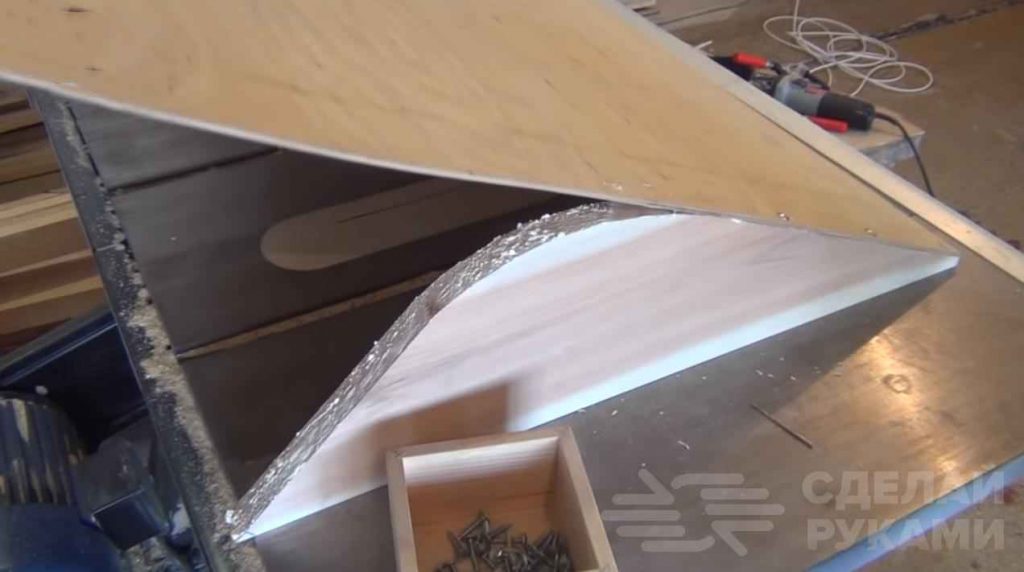 На следующем этапе необходимо будет прикрутить фанеру к боковым стенкам на саморезы. Для надежности доски и фанеру лучше склеить. ПВА для этой цели не подойдет — он боится влаги, но можно использовать монтажную пену.