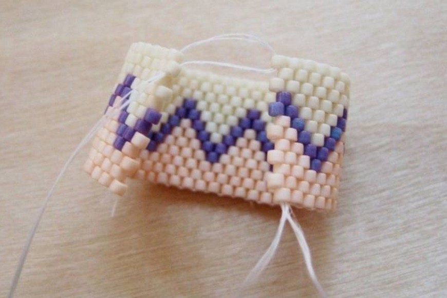 Бисер для ткачества может иметь любую форму и оттенок; допустимо также использовать в качестве декоративных элементов стеклярус и рубку. Однако стоит отметить, что лучше всего для таких работ подходит чешский и японский бисер. Хорошо откалиброванный, он имеет примерно одинаковую ширину и диаметр, что делает работу на станке значительно быстрее и легче, а ее результат – аккуратнее и красивее. Края стекляруса и рубки должны быть закруглены или отшлифованы – это сведет к минимуму риск того, что острые края повредят нить или разорвут ее. В качестве основы для ткачества можно использовать как мононить, так и леску – единственным требованием к рабочему материалу остается высокая прочность и гибкость. В процессе работы обязательно следите за натяжением нити, не позволяя ей натягиваться слишком туго или, наоборот, провисать. В случае, если вы планируете работать с мононитью, по возможности приобретите специальные нити для бисера – они обладают достаточной длиной для того, чтобы проходить через несколько рядов натянутых нитей и довольно небольшим ушком для того, чтобы проходить даже через самый мелкий бисер.