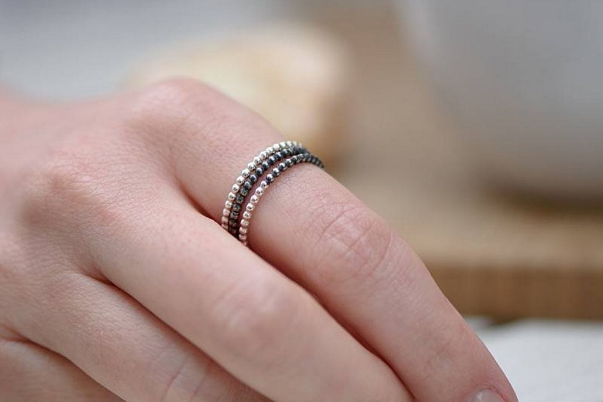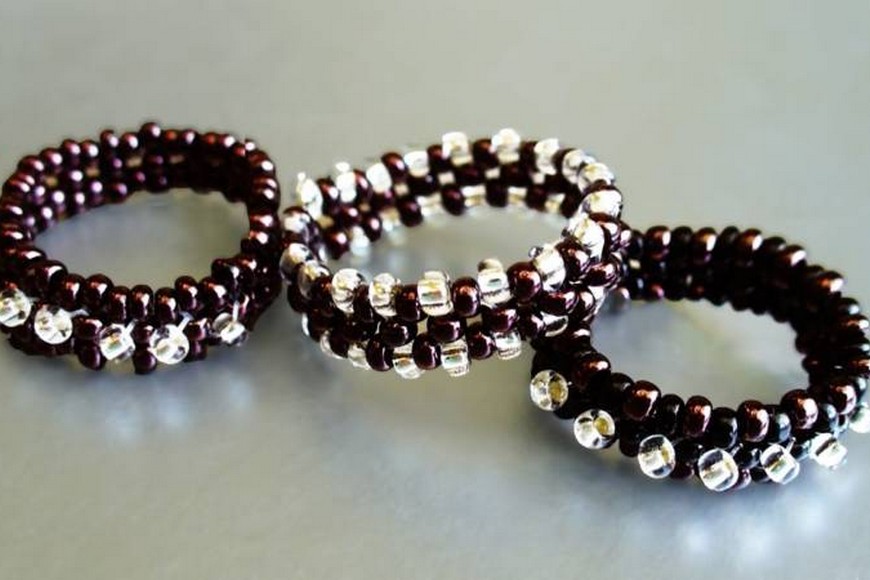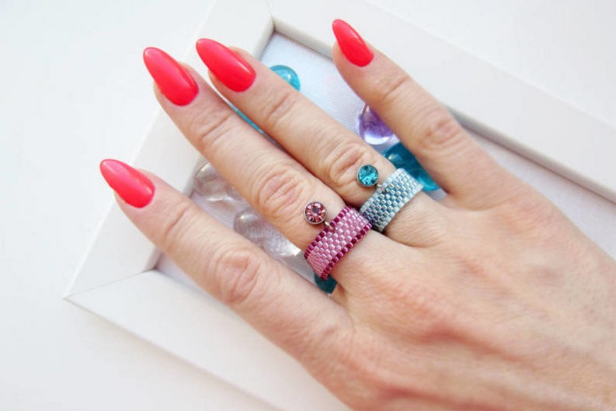 - Лёгкость. Многие схемы колец из бисера простые настолько, что вообще не требуют строгого соблюдения и могут меняться прямо в ходе работы. Сделать элементарное украшение можно за 30-60 минут, в один приём.