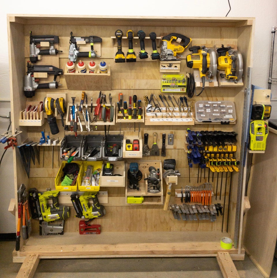 Своя особенность есть у электродрели, опять же, из-за формы корпуса, хранить ее нужно рукояткой вниз. Меньше всего проблем доставит фрезерный станок — у него плоская подошва, он прекрасно стоит вертикально. На полке для электроинструмента нужно предусмотреть место для хранения специальных ключей, сверл, запасных дисков для пилы и болгарки.