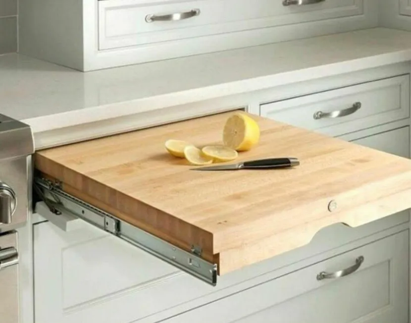 Выдвижная столешница – это отличная возможность сэкономить место на кухне, а при необходимости расширить рабочую зону или обеденный стол.