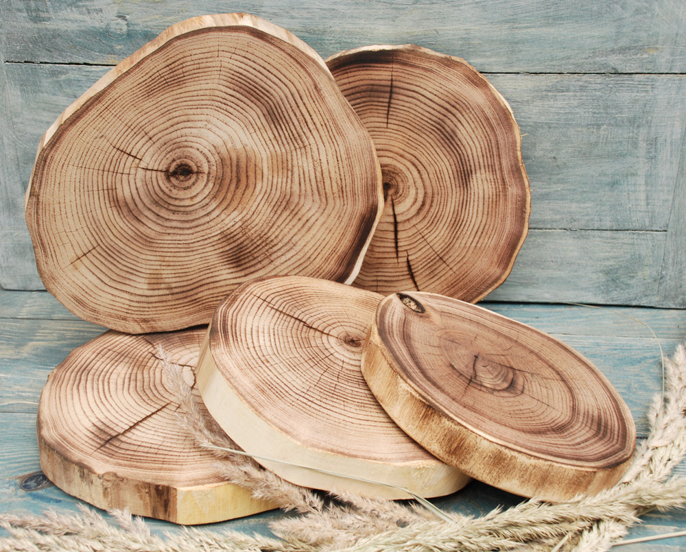 Спил дерева – это поверхность, образованная при поперечном (торцевом) разрезании ствола, веток или корней. Для поделок используются слои разной толщины, пни и поленья. Особенностью такого материала является проявление на торце неповторимого узора, образованного годичными кольцами.