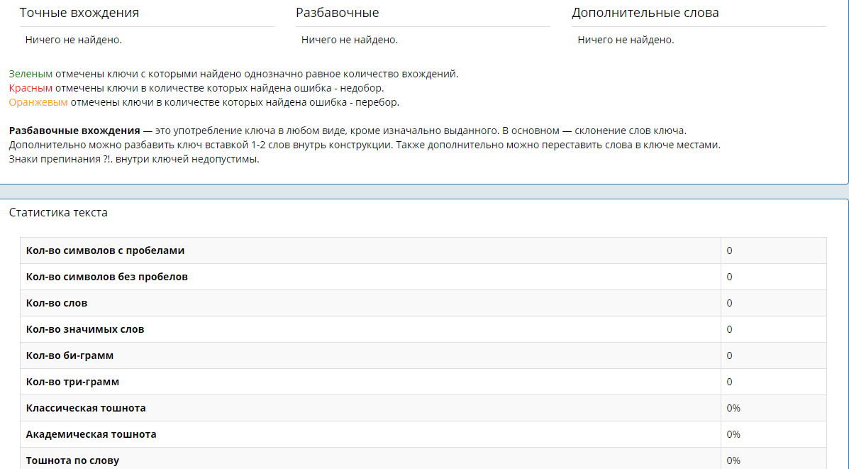 Сервис не только проверяет ключи, но и определяет другие SEO-параметры: тошнота по слову и общая, повторы, количество символов и слов (скрин ниже).
