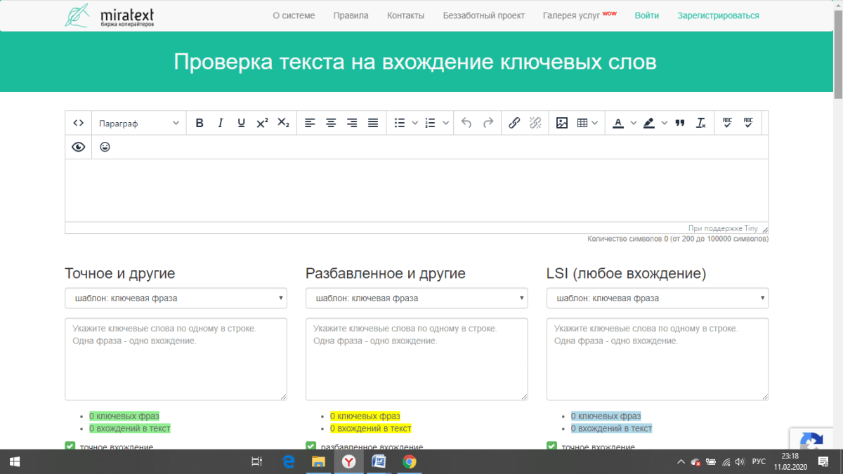 У тех людей, с кем я работаю сейчас, есть свои системы проверки, возможно, и вы встретите такого заказчика. Тогда проверять нужно внутри его системы. А вообще вот хороший и проверенный онлайн-сервис (он же еще одна биржа копирайтинга) для проверки ключей: https://miratext.ru/keywords-checker/.