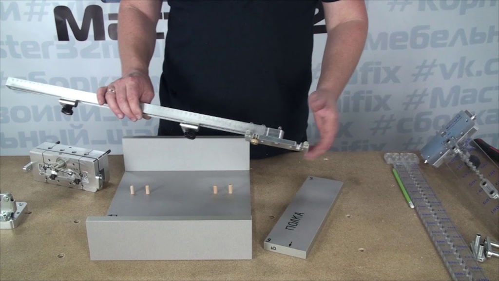 Именно они определяют линейность отверстий кондуктора. Выпиливаем пазы в трех заготовках, и соединяем их с помощью металлических плеч. Приспособление работает не хуже фабричного, при фактически нулевой стоимости. Еще один способ соединения мебели – использование так называемого конфирмата. Для этого нужен отдельный инструмент.
