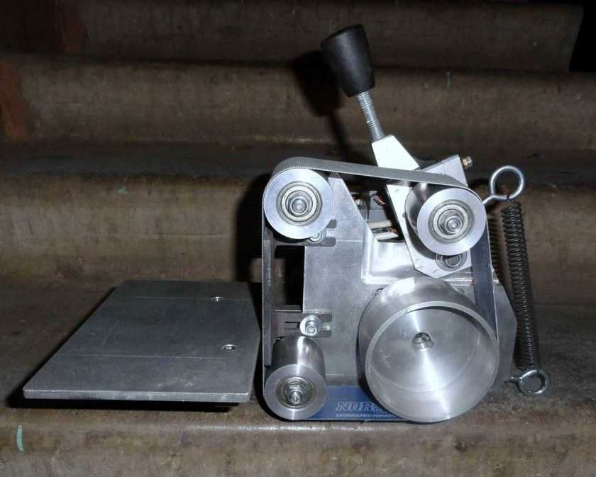 Схема с одним несоосным коромыслом в промышленности используется довольно редко, т.к. в принципе не позволяет добиться равномерного натяжения ленты. Однако дает точность, вполне достаточную в домашних условиях и позволяет построить очень неплохой простой гриндер.