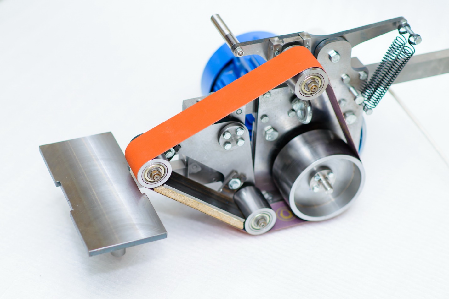 Если описывать конструкцию гриндера совсем просто, то это двигатель, 2-4 вращающихся ролика, один из которых регулируется, и шлифовальная лента. От ручной шлифмашинки гриндер обычно отличает фиксирующая стойка, с возможностью менять угол наклона.