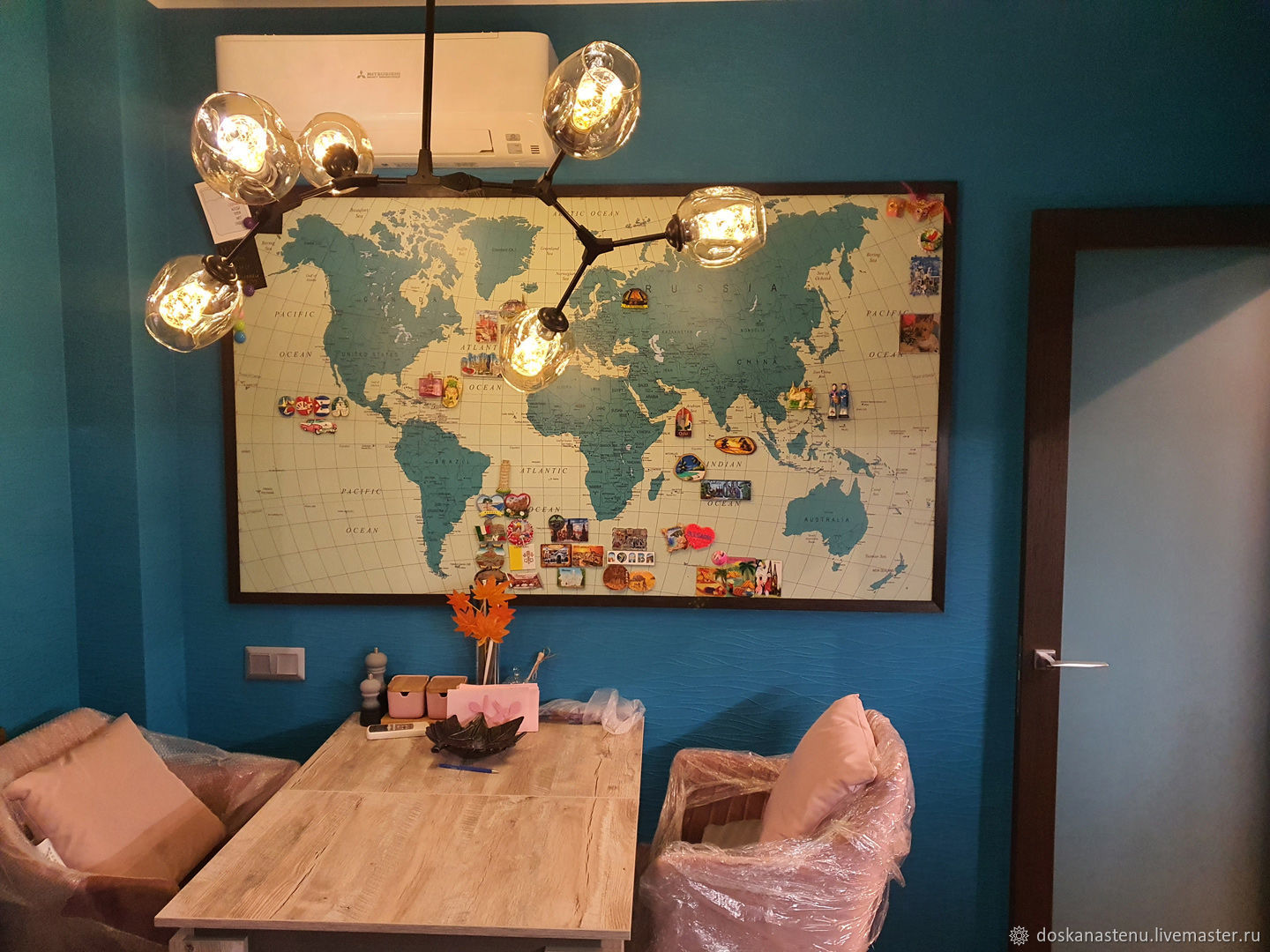 Новым и полюбившимся элементом домашнего интерьера все больше становятся магнитные доски. Почему? Да потому что с ними можно взаимодействовать. Писать друг другу послания, делать напоминалки, объяснять ребенку что-то по учёбе, рисуя ему маркерами про полтора землекопа, либо (самый скучный вариант), можно просто крепить на неё магниты из поездок, раз уж поверхности холодильника оказалось недостаточно. Магнитная доска необязательно должна напоминать чистый белый лист. Магнитной может быть, например, карта мира — странствовать по ней магнитными фишками наверняка понравится путешественникам.