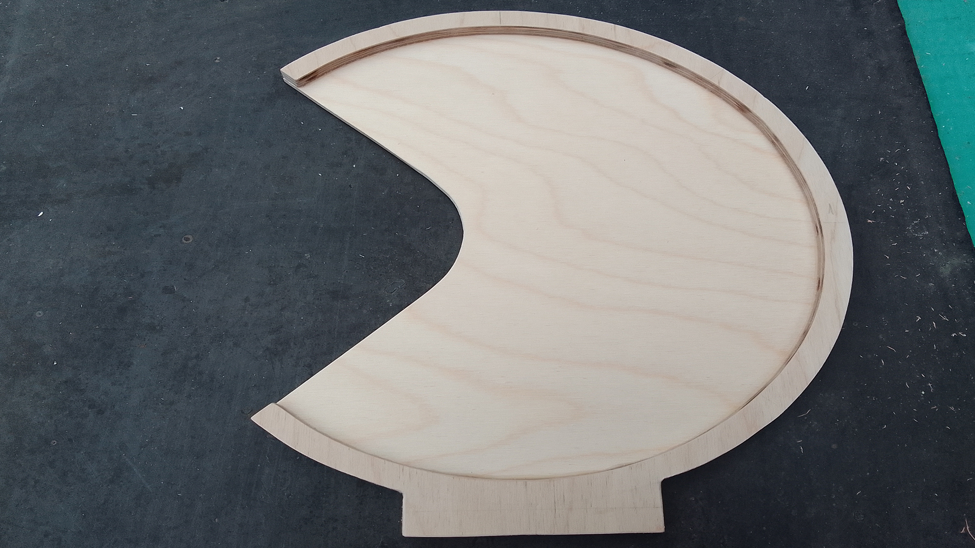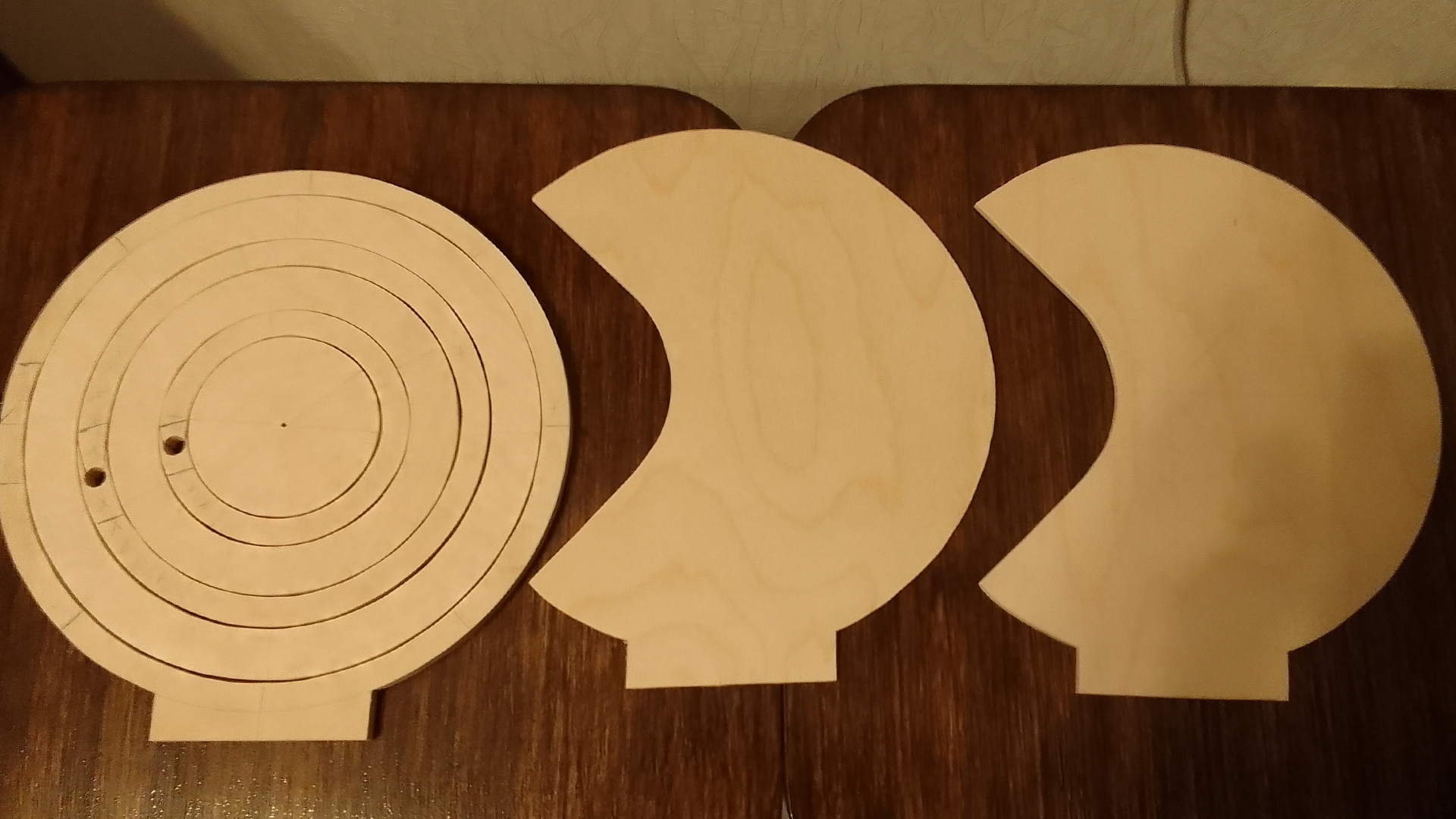 После того как выпилены окружности, обведите получившийся трафарет заготовки на два других листах фанеры и выпилите. У каждой заготовки нарисуйте своеобразный треугольник по вашему усмотрению и округлите внутренний угол. Сам угол может быть больше или меньше, но не менее 45 градусов.