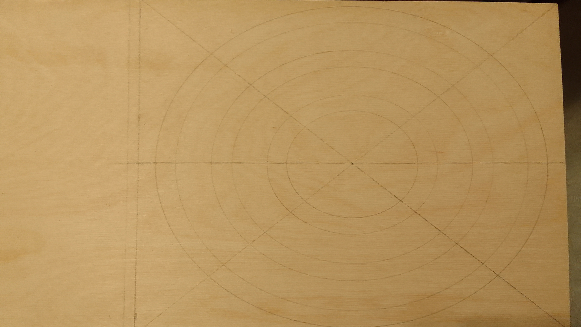 Один квадрат фанеры размечаем с помощью циркуля. Отметьте середину заготовки. От середины расчертите диагонали и шесть окружностей. Диаметры окружностей берите произвольно.