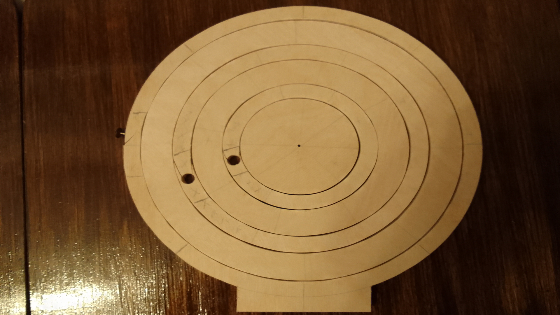 После первоначальной сборки и окончательной шлифовки переходим к самому интересному. Начинаем размечать календарь на даты. Самую большую окружность делим на 31 часть. Здесь понадобиться некоторая сноровка и знания азов геометрии. Круг поменьше делим на 12 частей там будут размещаться месяцы. Самый маленький, который размещен посередине размечается на 7 равных частей, на нем будут размечены дни недели.