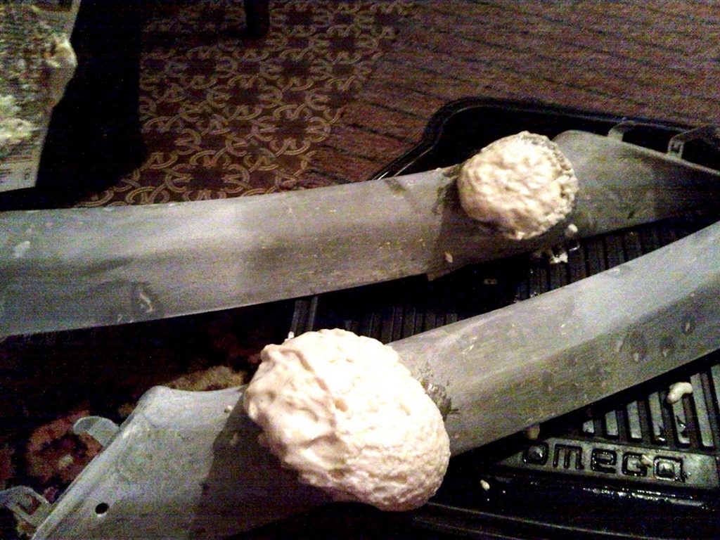 В подшипник установить трубу нужной высоты 14-16 см. Труба должна крепко стоять и крутиться за счет механизма. Металлический круг необходимо приварить к трубке с помощью обычной или холодной сварки. Холодная сварка похожа на пластилин, ей удобно работать, не имея опыта. Поверх металлического круга закрепить окружность из дерева. Верх можно украсить самоклеящейся пленкой соответствующего цвета. Поднос крутящийся для торта готов!